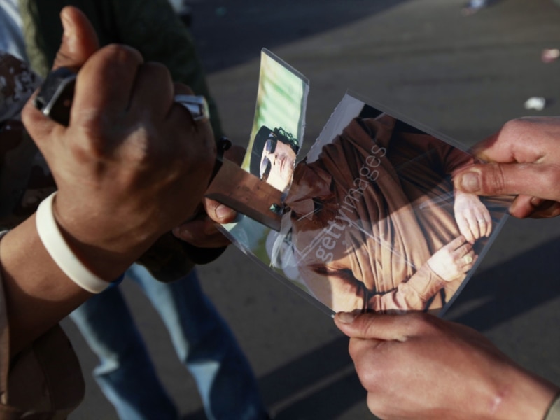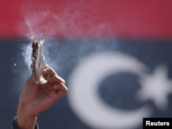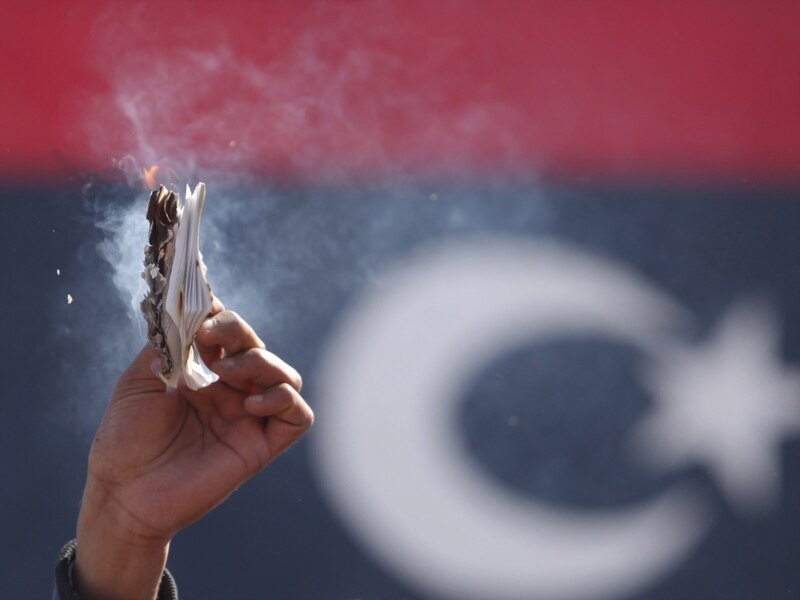 Супротивник Каддафі спалює на демонстрації в Бенгазі його програмовий твір, «Зелену книгу», на тлі старого прапора Лівії часів до перевороту Каддафі 1969 року, який узяли собі повстанці. Фото 25 березня 2011 року
