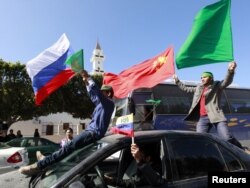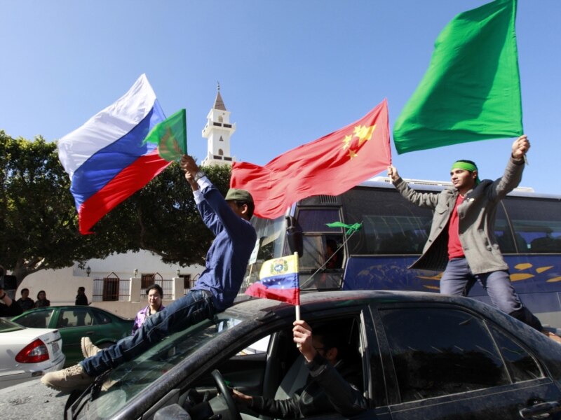Прихильники Каддафі в Тріполі з зеленими прапорами нинішньої Лівії і з прапорами Росії, Китаю та Венесуели, яких вони вважають за захисників Каддафі. Фото 24 березня 2011 року