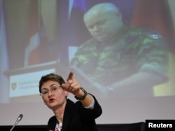 Речниця НАТО Оана Лунджеску повідомляє в Брюсселі про перебіг операції. На екрані відеоконференцією з Неаполя командувач операції генерал-лейтенант Шарль Бушар