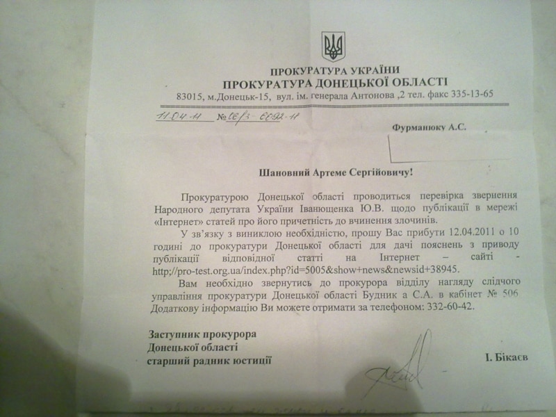 11 квітня, через кілька днів після усного запрошення, на адресу за місцем моєї прописки прийшло вже письмове прохання з’явитися. Незабаром із прокуратури Донецької області зателефонували також редакторові сайту «Острів», а пізніше прокуратура Оболонського району Києва запросила на бесіду і безпосереднього автора крамольної статті. Більш того, редактор «ОРД» заявив про здійснену на сайт видання тривалу ddos-атаку, що сталася після його відмови від зустрічі зі слідчим.