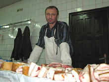 Ігор з Черкащини, торгує на ринку м’ясом не перший рік. У Київ їздить тому, що тут ринок працює з ранку до вечора і ціни вищі. Вдома його чекають дружина і господарство — четверо свиней, корова та кури. Ігор підтверджує: лабораторія працює, йому лише не подобається ціна за довідку: засвідчити нормальну якість однієї туші коштує 24 гривні (слухати):