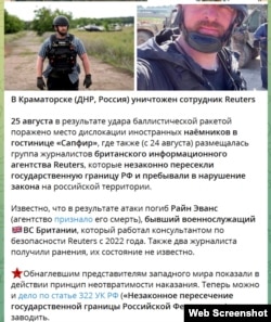 Експерт з безпеки агенції Reuters Райен Еванс став одинадцятим вбитим журналістом, який загинув під час виконання своїх професійних обов'язків в Україні.