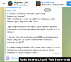 На цьому ж каналі раптово згадують про випадок із загибеллю дитини у селищі Олександрівське навесні 2021 року. Тоді реальну смерть хлопчика від боєприпасу російські ЗМІ протрактували як удар українського безпілотника. Хоча на той момент такі в ООС не застосовувалися, а свідків прольоту не було (ударний БПЛА є досить великим).