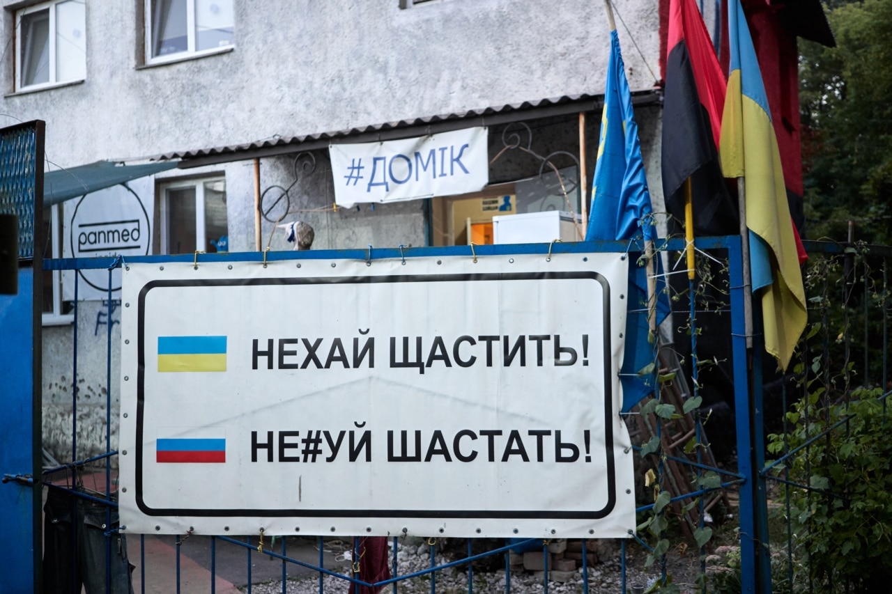 «Ви по запису?» – питає нас жінка, що виходить з триповерхового будинку, розмальованого в червоно-чорні кольори. Це командний пункт і база дантистів-волонтерів з проєкту «Тризуб Дентал». Карлівка, Донецька область, кілометрів 20 до Донецька.