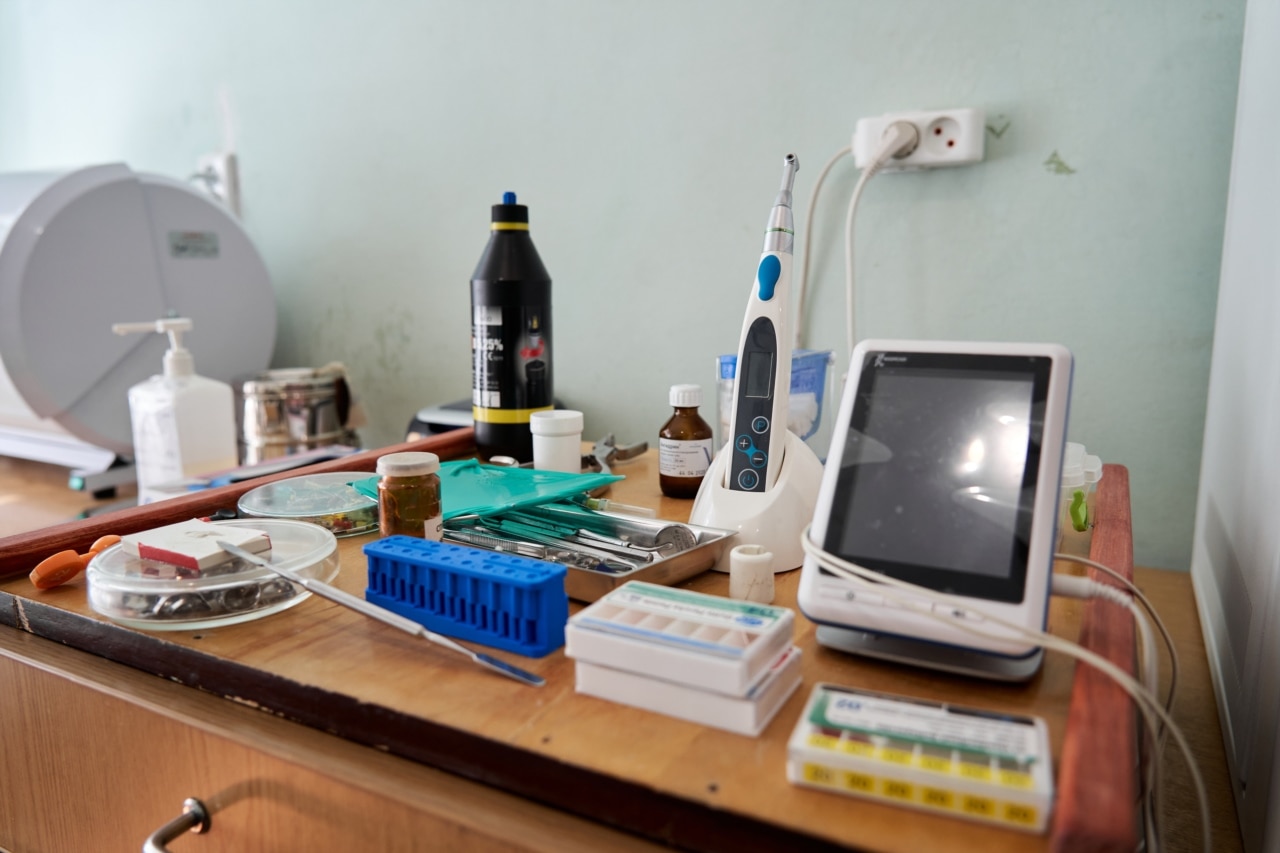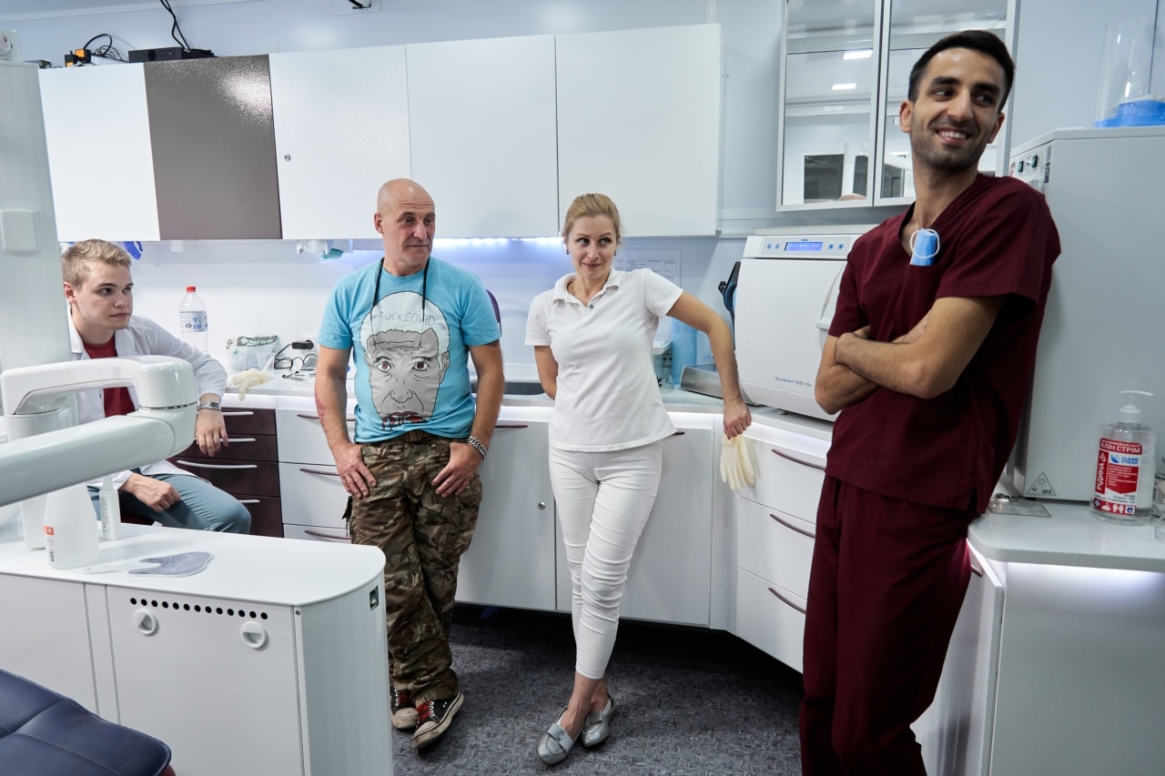 «Більше року тому в нас з’явився кабінет «Слон». Там можна робити КТ, встановлені мікроскопи та інше нове і сучасне обладнання. Таке саме сучасне обладнання стоїть у стаціонарному кабінеті в будиночку. Асортимент дуже широкий: не в усіх лікарнях є те, що є тут. За правилами, лікарі мають везти свої інструменти, але все, звісно, не привезеш. І кожен в нас знаходить те, що йому потрібно», – трохи хизується Олег. Він сам спеціаліст загального профілю, ще не обирав спеціалізацію. Може чистити каміння, може видаляти зуби, може ставити пломби.