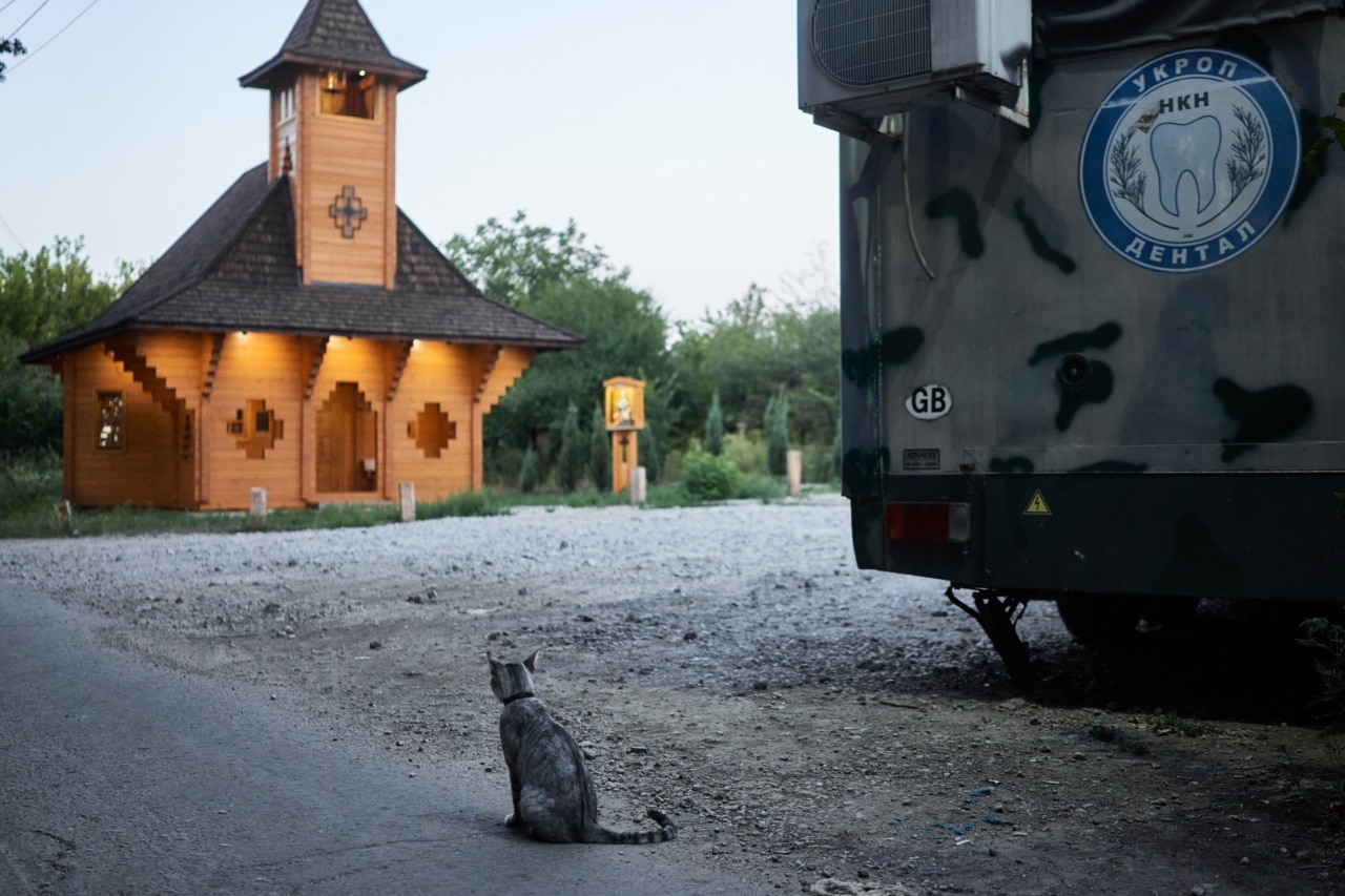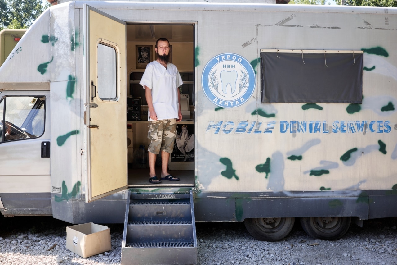 Ми приїхали до лікарів на День незалежності, спеціально, щоб пацієнтів було поменше, і можна було спокійно поспілкуватися зі стоматологами, які вже 5 років безоплатно лікують військових і місцевих жителів. Один мобільний кабінет перетворився на цілий флот фургонів та автівок, де можна ставити пломби, робити операції та навіть панорамні рентгенівські знімки.