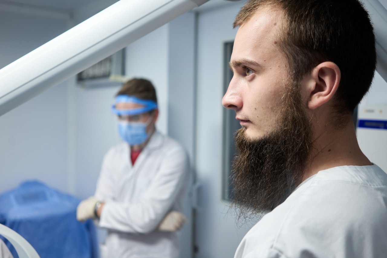 Ми спілкуємось з одним із солдатів уже після лікування. Він виходить з кабінету і тримається за щоку. Солдата звати Ерік, він з Києва і воює вже два роки. Першого разу боєць прийшов до «Тризубу» в жовтні 2019 року, й відтоді довіряє йому більше, аніж лікарям у рідному місті.