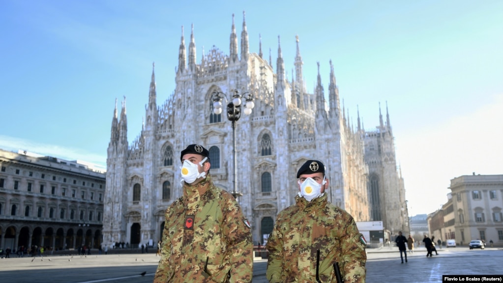 Фото: Військові в захисних масках на площі біля собору Дуомо, закритого владою через спалах коронавірусного захворювання, Мілан, 24 лютого 2020 року