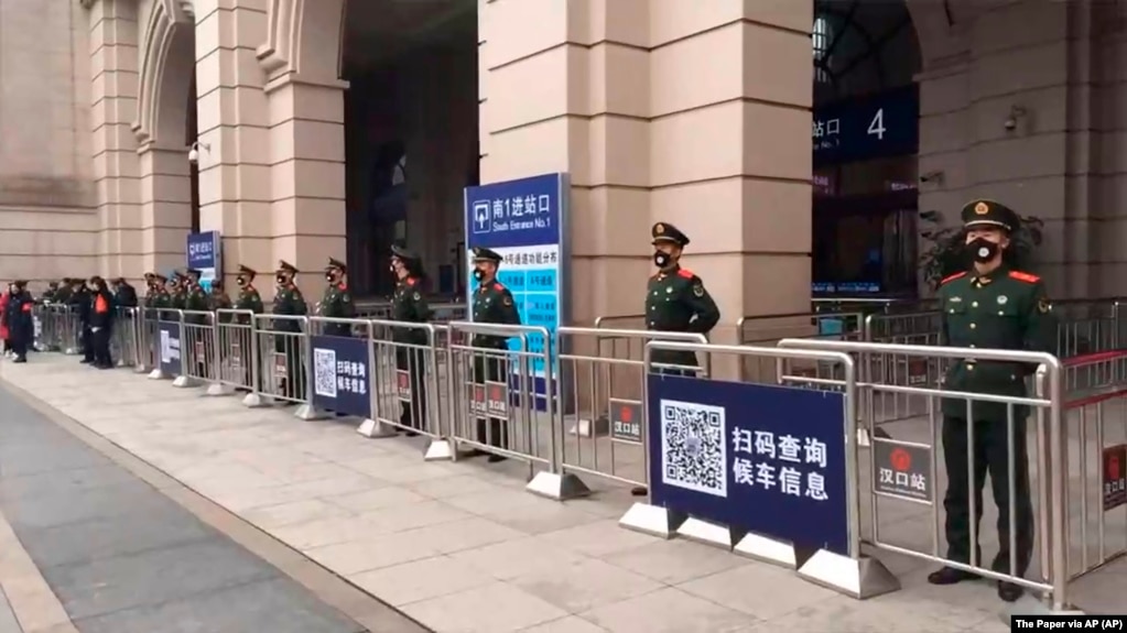 Фото: Китайська воєнізована поліція стоїть на варті біля закритого залізничного вокзалу «Ханькоу» в Ухані, 23 січня 2020 року
