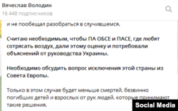 «Считаю необходимым, что ПА ОБСЕ и ПАСЕ, где любят сотрясать воздух, дали этому оценку и потребовали объяснений от руководства Украины. Необходимо обсудить вопрос исключения этой страны из Совета Европы», – написал Володин.