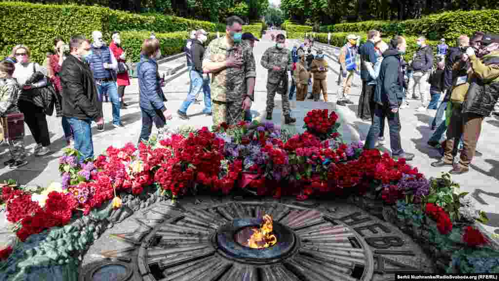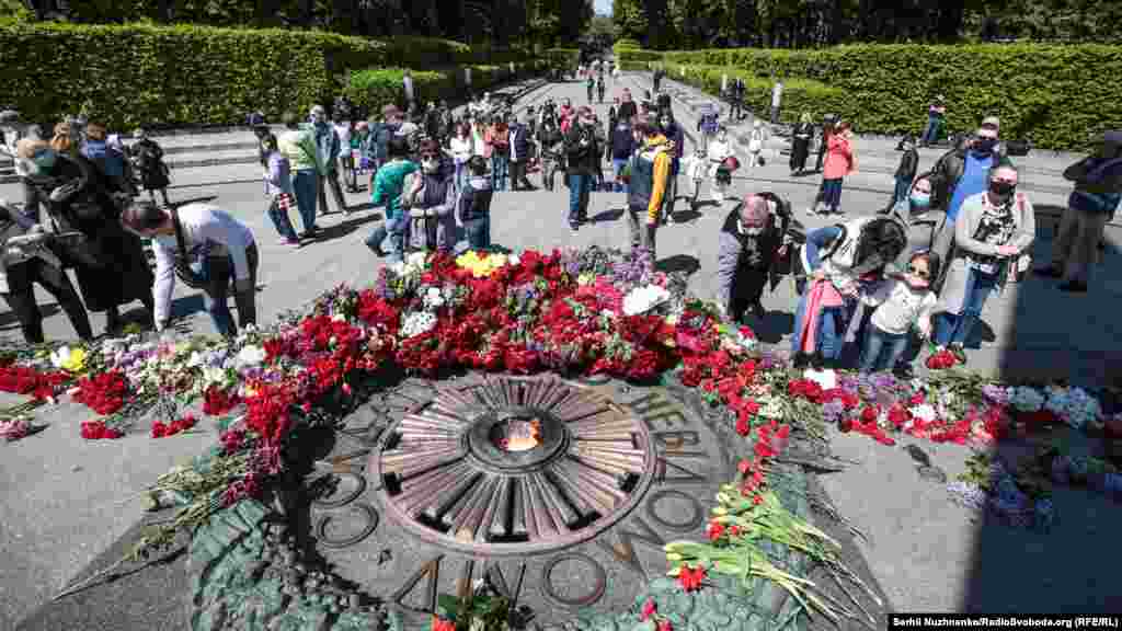 З ранку, 9 травня, до Вічного вогню у Парку Слави у Києві усі бажаючі несуть квіти, з нагоди Дня перемоги над нацизмом у Другій світовій війні. Поліція людей пропускає по двоє й попереджає про безпечна дистанцію в умовах епідемії. Крім того кожен обов’язково має одягнути захисну маску. Традиційно, заборонено носити комуністичну символіку, за наявність такої поліцейські складали протоколи. З квітами прийшов і очільник УПЦ (МП) митрополит Онуфрій, разом із народним депутатом Вадимом Новинським провели молебен. Раніше народний депутат заявляв, що у нього діагностували хворобу COVID-19. За неофіційною інформацією, минулого місяця коронавірус виявили і в митрополита Онуфрія, однак церква офіційно цього не підтвердила. Попри обмеження поліцією на вхід до Парку Слави, відкритою була територія «Національного музею історії України у Другій світовій війні». Детальніше дивіться у відео Радіо Свобода.