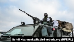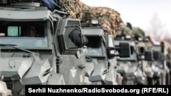 Бронеавтомобілі перед завантаженням підрозділів десантно-штурмових військ ЗСУ.