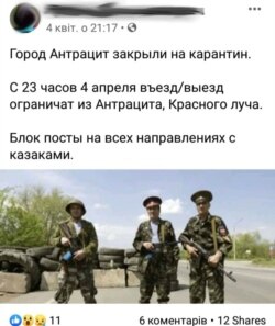 «Антрацит закрыт. По улицам ездит машина с рупором и там говорят, что «оставайтесь дома». В город никого не впускают и никого не выпускают. Есть исключения по веской причине, но потом им выдают бумажку о самоизоляции. Количество техники военной увеличилось, «военных» также стало значительно больше», – рассказывает житель Антрацита.
