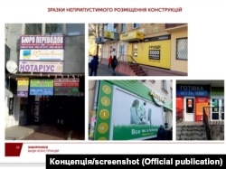 В документі Концепції є фото, на яких показані «неприпустимі розміщення конструкцій». Якщо узагальнити, то «небажаними» є всі яскраві вивіски, які мають одразу кілька кольорів, та великі за розміром.
