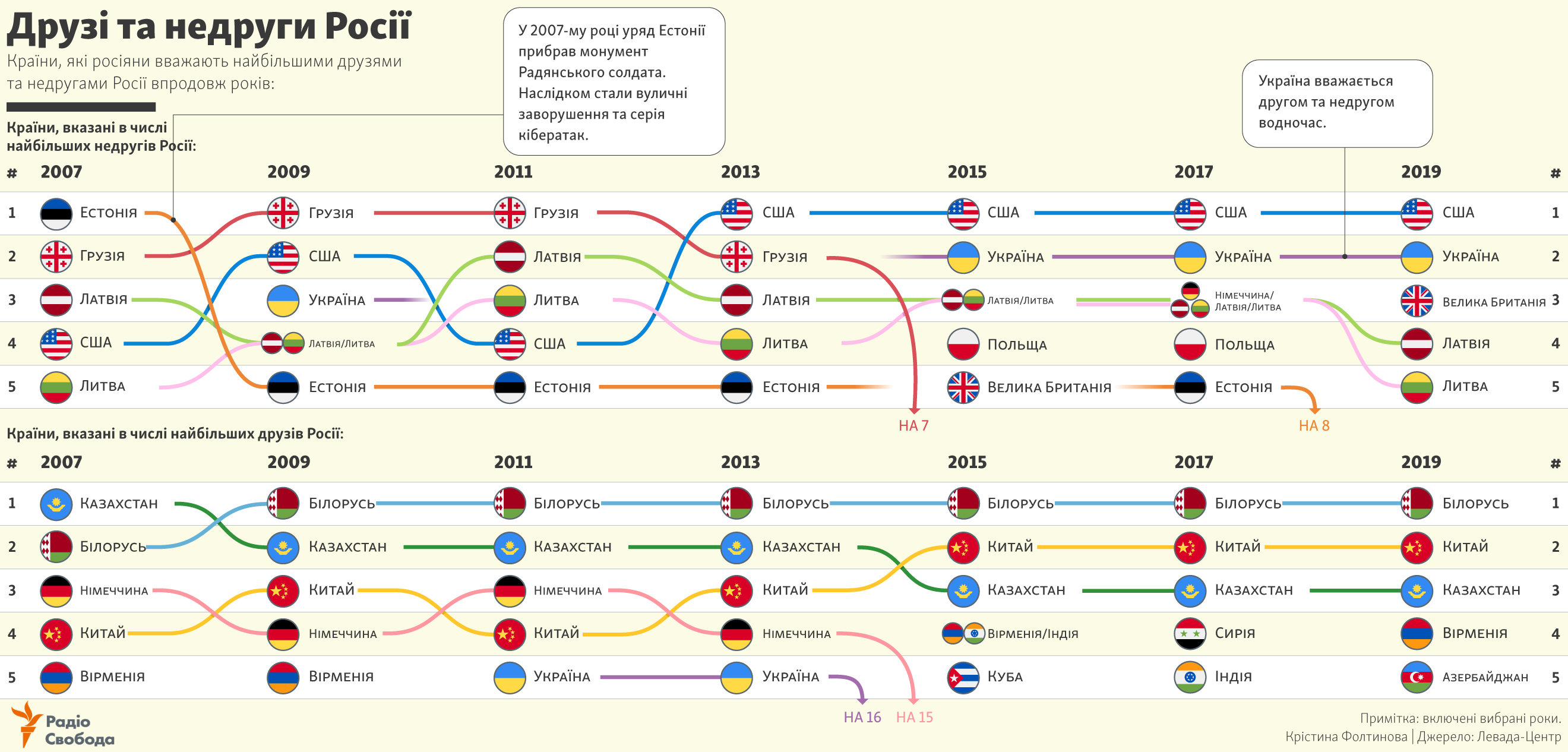 Країни, які росіяни вважають найбільшими друзями та недругами Росії впродовж років.