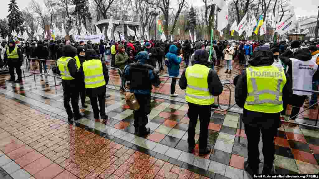 Через анонсовані масові заходи та виступ президента України Володимира Зеленського у Верховній Раді в урядовому кварталі зранку посилили охорону вулиць, місцями також обмежили рух транспорту.