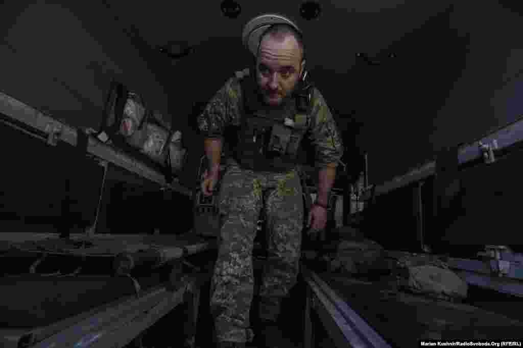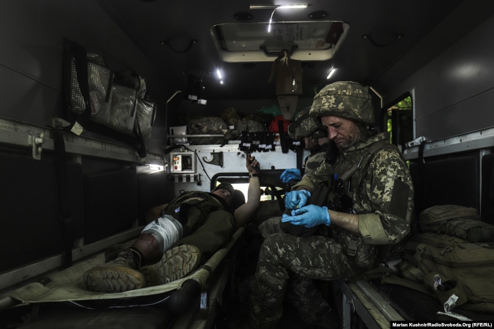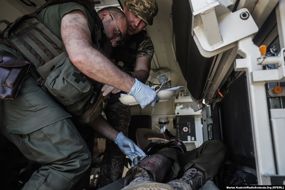 Військові медики надають пораненому бійцю медичну допомогу в польових умовах в районі Світлодарська Донецької області.