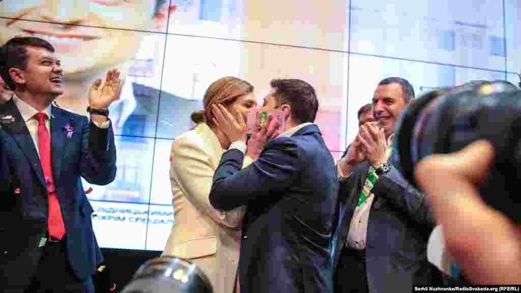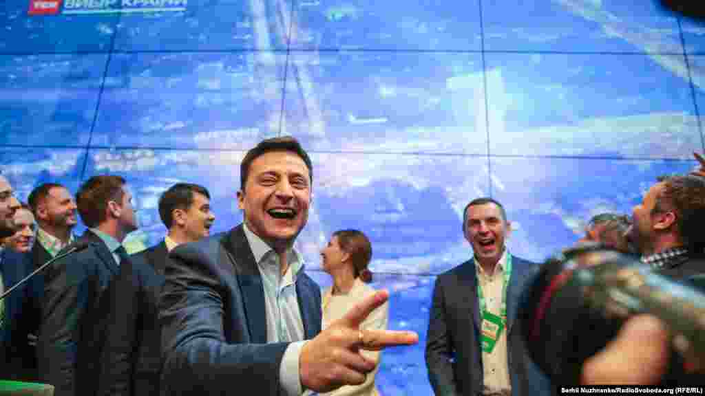 За результатами Національного екзит-полу, лідера перегонів Володимира Зеленського підтримали рівно 73% виборців, чинного президента Петра Порошенка – 25,5% учасників голосування. У результатах, оприлюднених одразу після закриття виборчих дільниць, Зеленський мав на 0,2% підтримки більше, Порошенко – настільки ж менше. Що відбувалося у штабі Зеленського - в фоторепортажі Радіо Свобода.