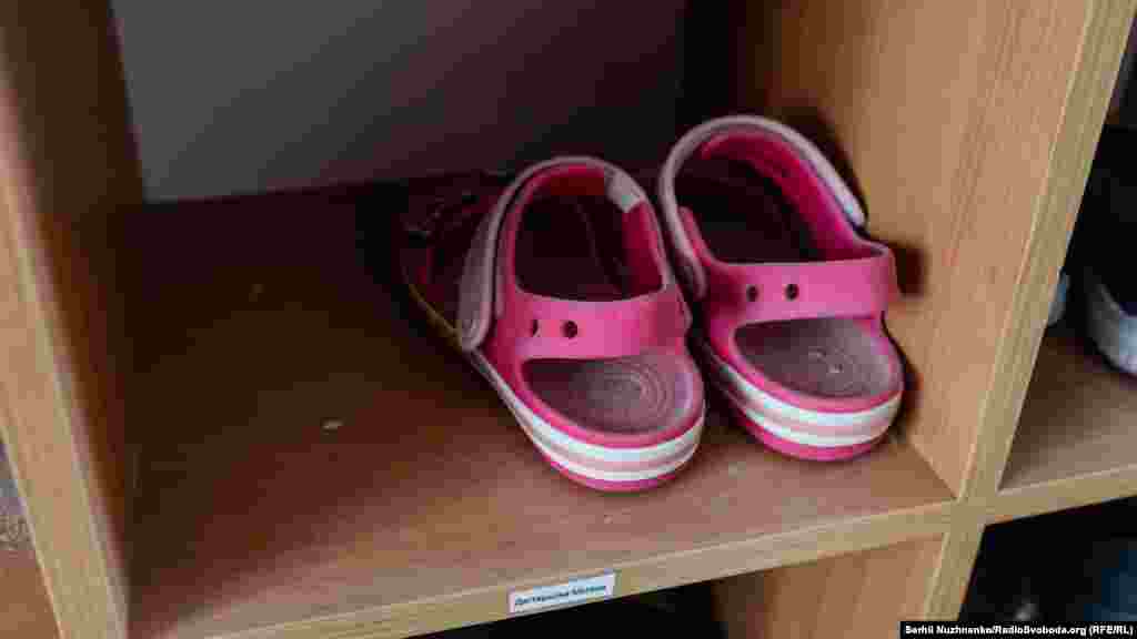 Шафа з дитячим взуттям у пошкодженому обстрілами збройних сил РФ дитячому садочку в Сєвєродонецьку, 16 квітня 2022 року