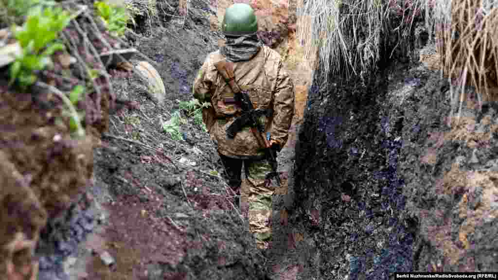 Український військовий йде в окопі на позиціях на лінії фронту. Донецька область, 22 квітня 2022 року