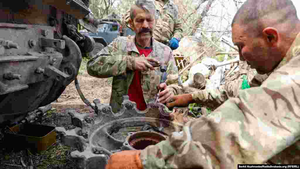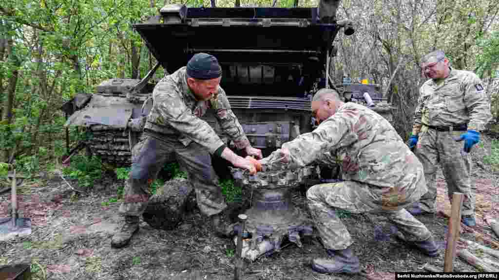 Українські військові ремонтують танк на позиціях. Харківська область, 1 травня 2022 року