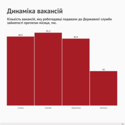 Варто зауважити, що співвідношення між кількістю працівників та робочих місць і до карантину було не на користь останніх. Станом на 1 березня 2020 року дефіцит вакансій, за даними ДСЗ, по Україні становив -300 265 робочих місць. На 1 травня цей показник дорівнює -403 906 вакансій – тобто стільки їх треба, щоб забезпечити роботою всіх, хто став на облік у державному відомстві.
