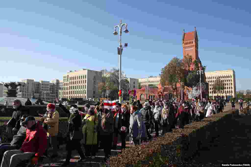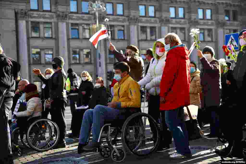 Білоруси з інвалідністю несли квіти і заборонені біло-червоно-білі прапори опозиції, коли мирно проходили вулицями Мінська 22 жовтня під час опозиційного заходу під назвою «Марш людей з нескінченними можливостями».