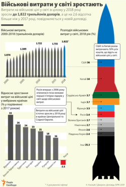 Витрати на військові цілі у світі в цілому у 2018 році зросли до 1,822 трильйонів доларів, а це на 2,6 відсотка більше ніж у 2017 році, повідомляється у новій доповіді.