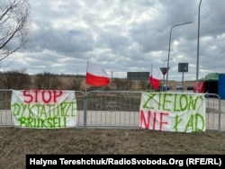 «Європейська політика нищить польського фермера» – головне гасло при дорозі, яку перекрили в обидва боки. Пропускають без черги лише автобуси і легкові автомобілі, але ті під’їжджають до пункту пропуску об’їзною дорогою.