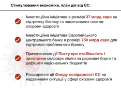 Також Єврокомісія тимчасово скасувала бюджетні правила для членів ЄС. Приміром, через надання коштів на підтримку економіки державний борг Франції перевищить сто відсотків ВВП. Це значно більше шістдесяти відсотків, дозволених Пактом про стабільність і зростання. Тимчасове скасування правил дозволить Франції, а також іншим країнам, не порушувати ключовий документ єврозони.​