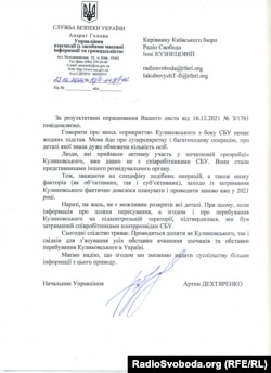 «Говорити про якесь прикриття Куликовського з боку спецслужб немає підстав, – стверджується у листі відомства. – Мова йде про цілком таємну операцію, про яку знало дуже обмежене коло людей. Люди, які брали участь у початковій розробці Куликовського, вже давно не є співробітниками СБУ. Вони стали працівниками іншого розвідувального органу. З огляду на низку факторів, заходи із затримання Куликовського довелося планувати заново вже у 2021 році. Наразі, на жаль, не є можливим розкрити всі деталі. Коли інформація про перебування і пересування Куликовського на території України підтвердилась, він був затриманий контррозвідкою СБУ. Сьогодні слідство триває. Сподіваємося, з часом ми зможемо надати суспільству більше подробиць».
