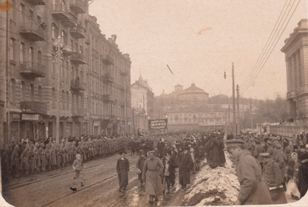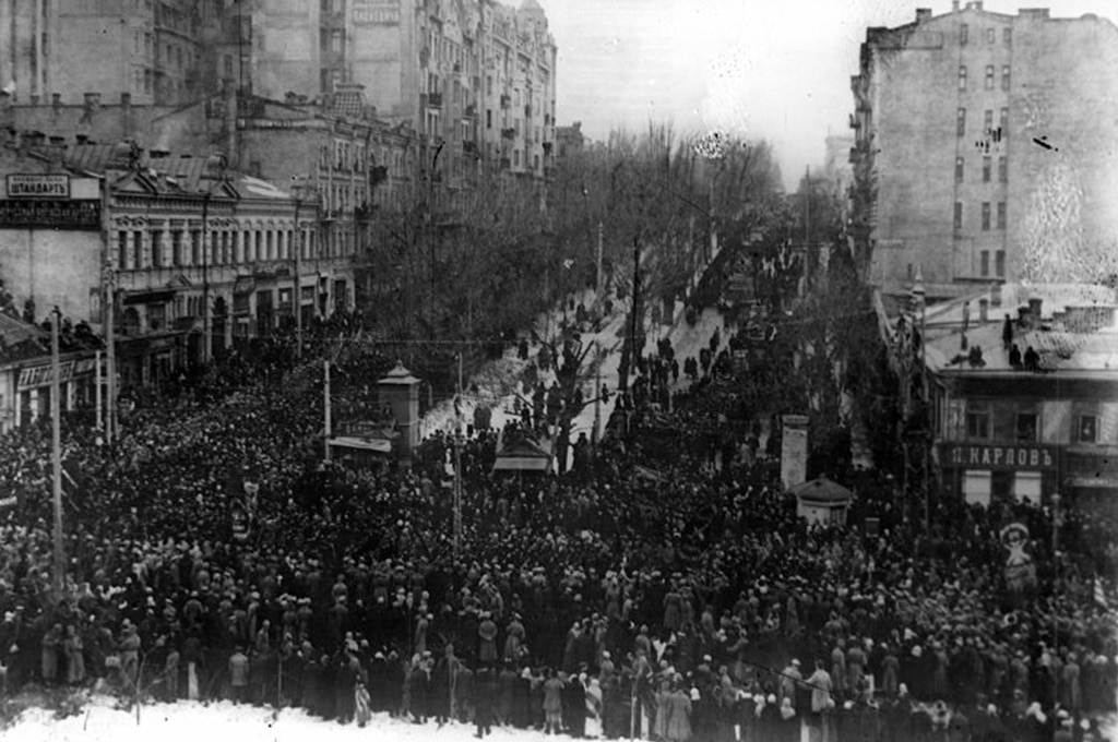 Революційна маніфестація на розі Бессарабської площі та Бібіковського (тепер Тараса Шевченка) бульвару, весна 1917