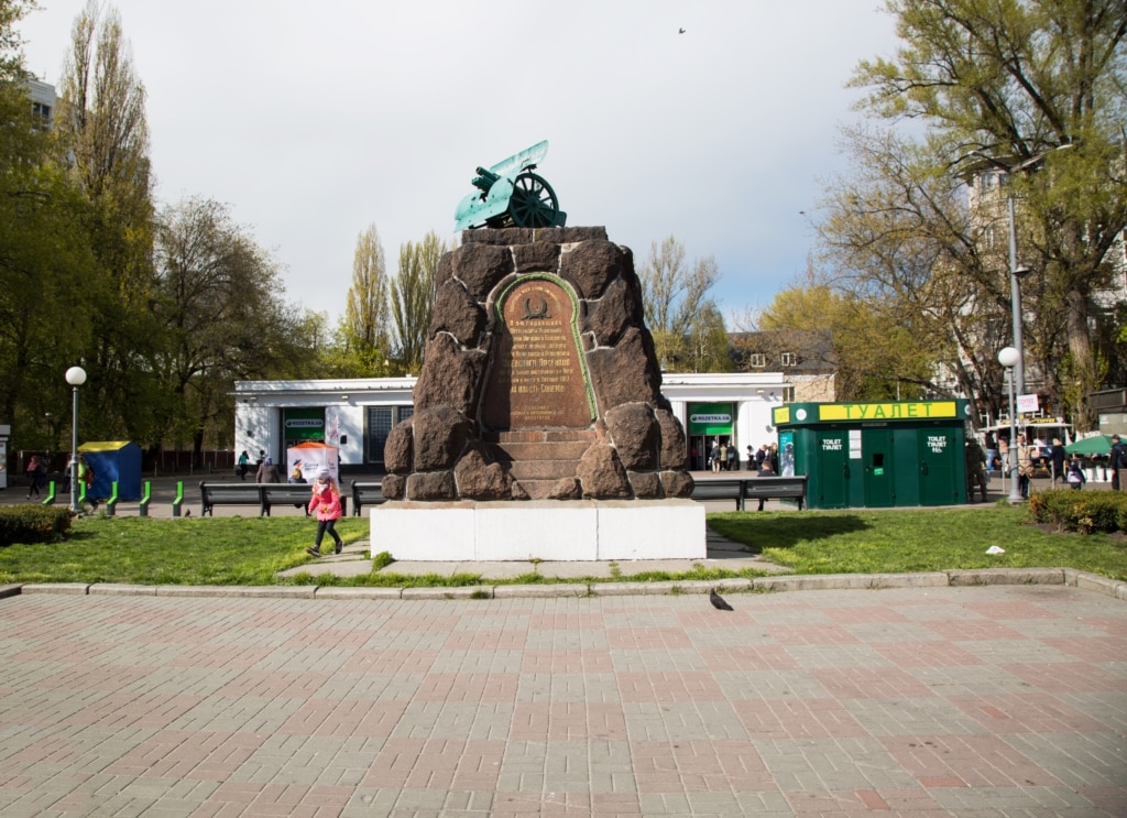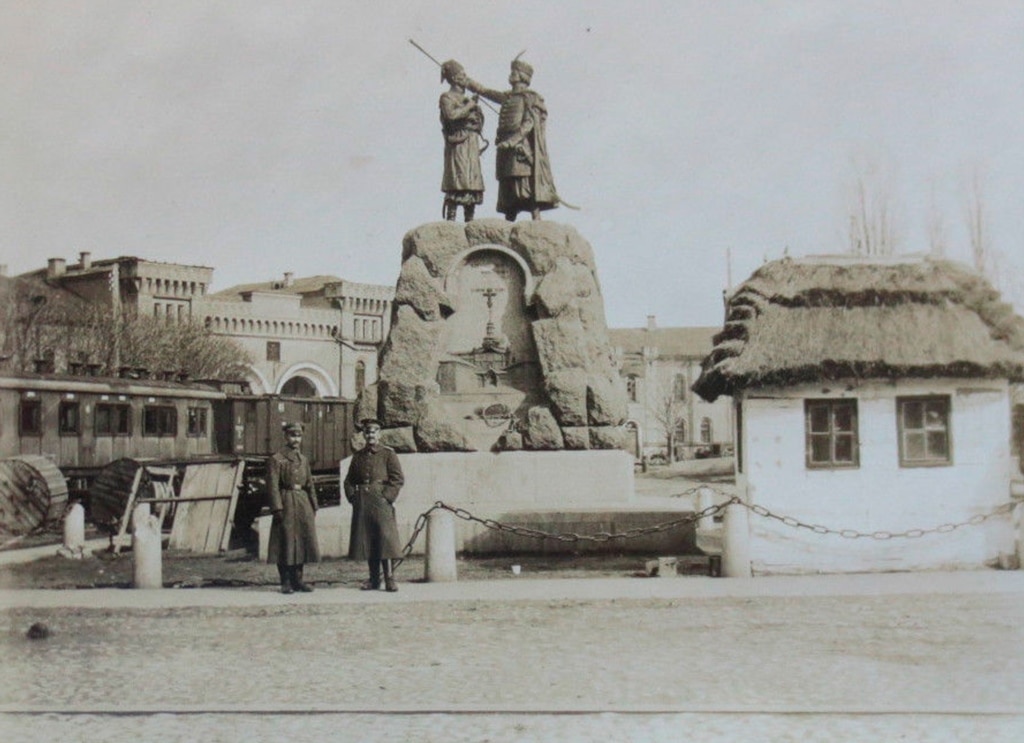 Німецькі військові біля пам’ятника Кочубею та Іскрі, весна 1918. Тепер на цьому постаменті пам’ятний знак – гірська гармата – на честь робітників заводу «Арсенал», які підняли повстання проти Центральної Ради.