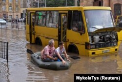 Чоловік на гумовому човні допомагає людям пересуватися затопленою частиною у місті Львові після сильної зливи, 17 серпня 2018 року