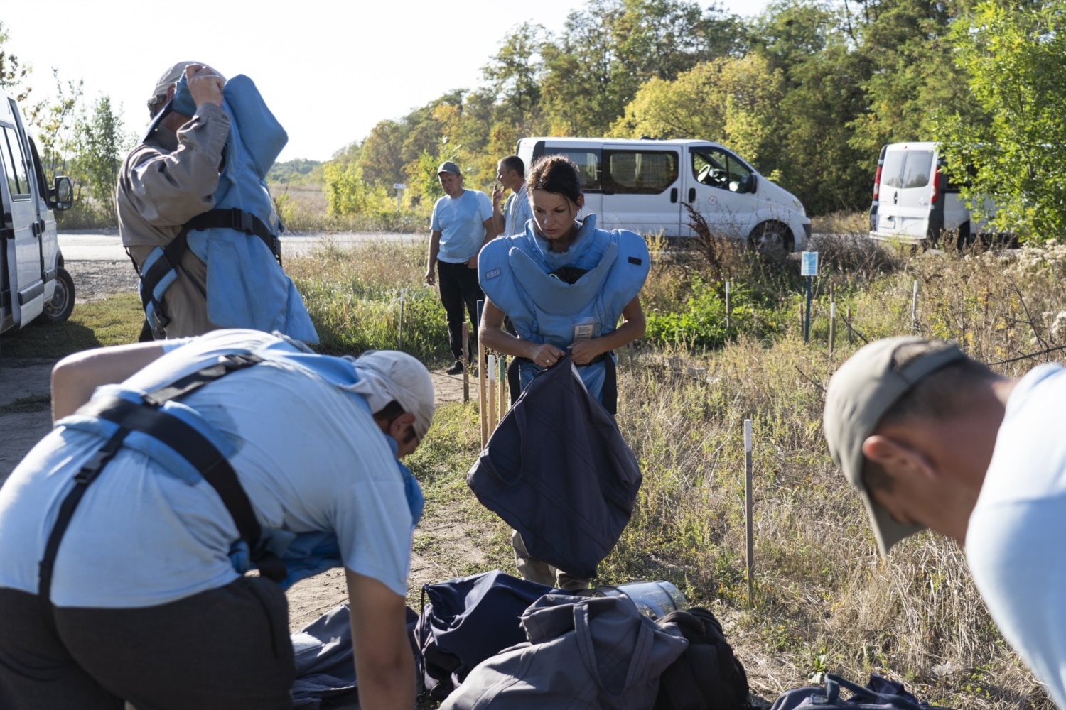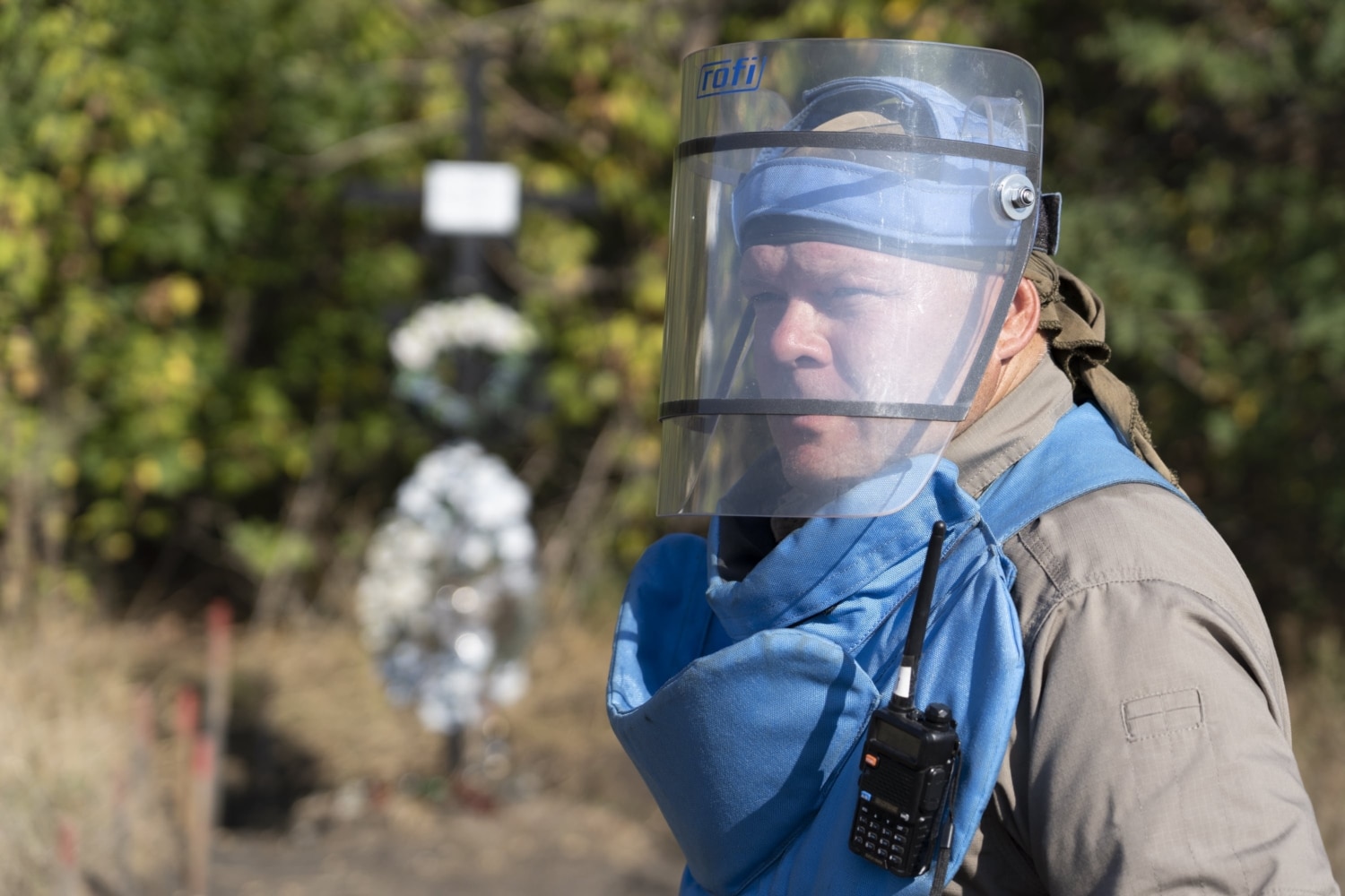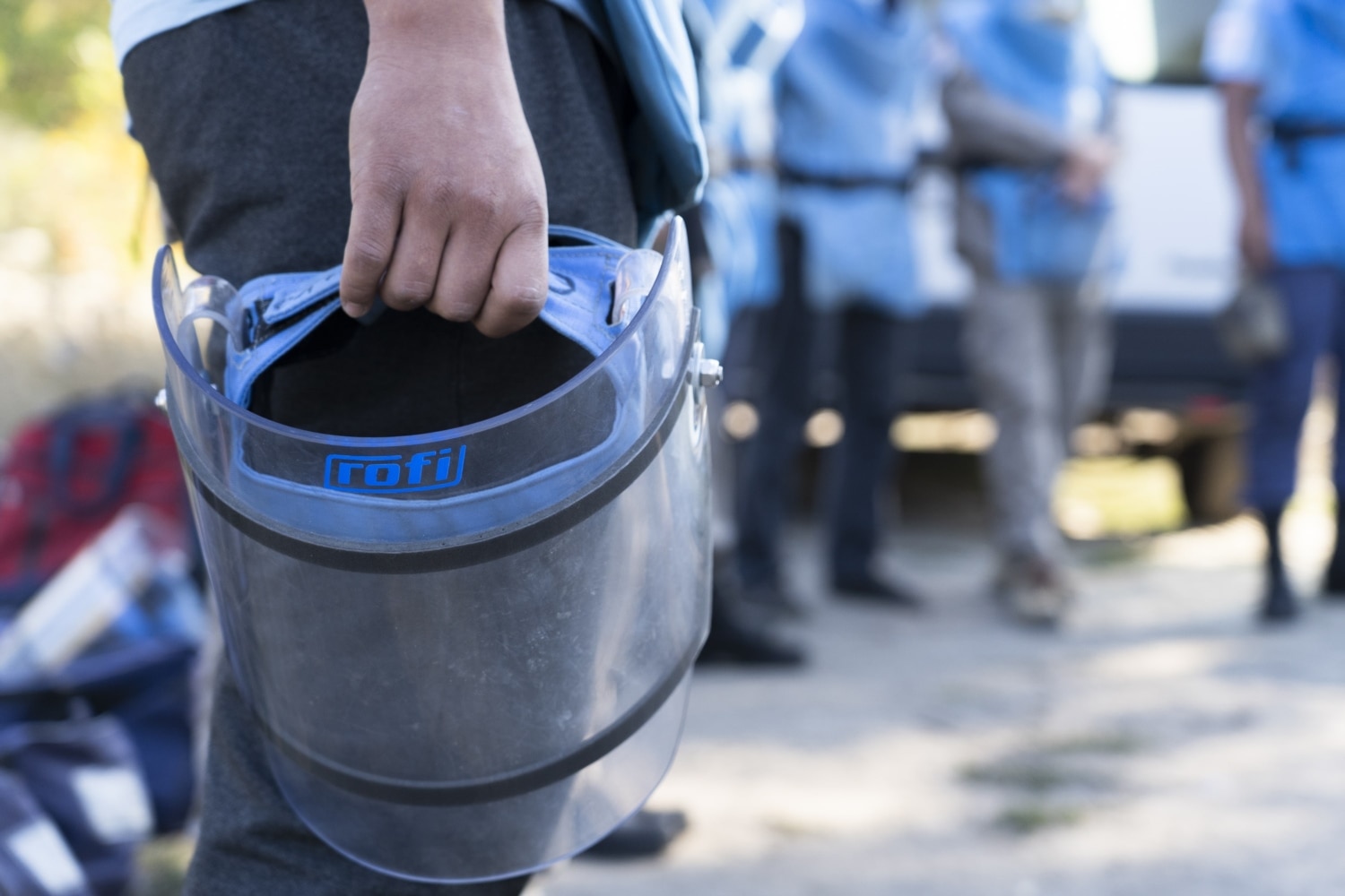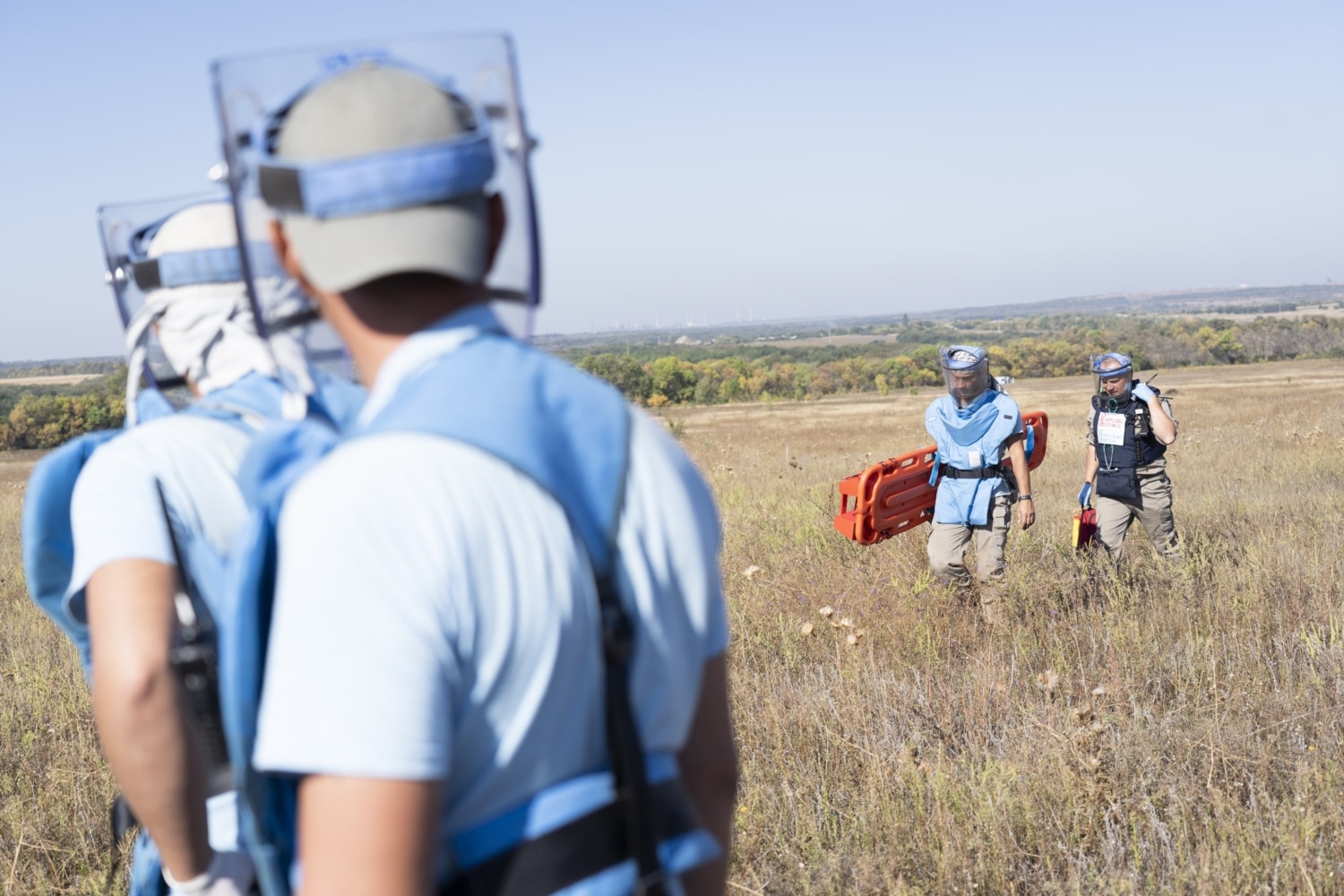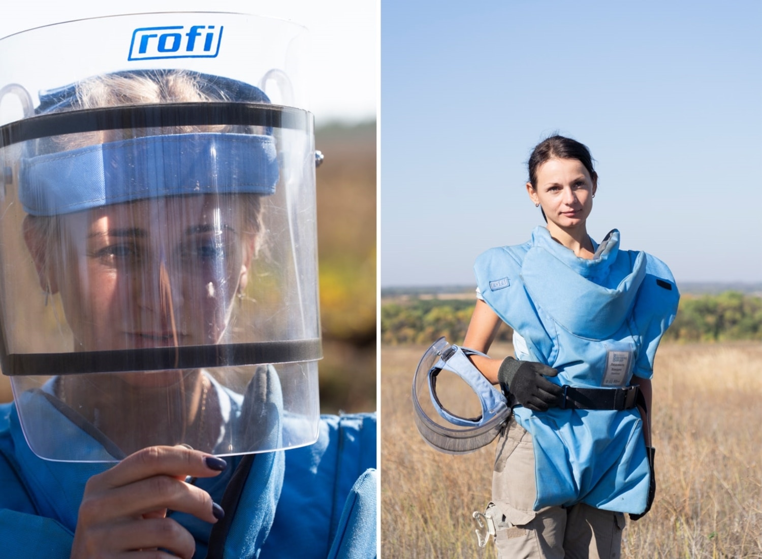 Затримати дрібні осколки від протипіхотної міни в разі вибуху мають кевларовий фартух та візор – те саме прозоре забрало на обличчі з двох шарів полікарбонату. Цей персональний захисний комплект вдягає кожен демінер перед початком роботи. Знімати будь-що можна лише тоді, коли пролунає свисток командира групи, що сповіщає про перерву.