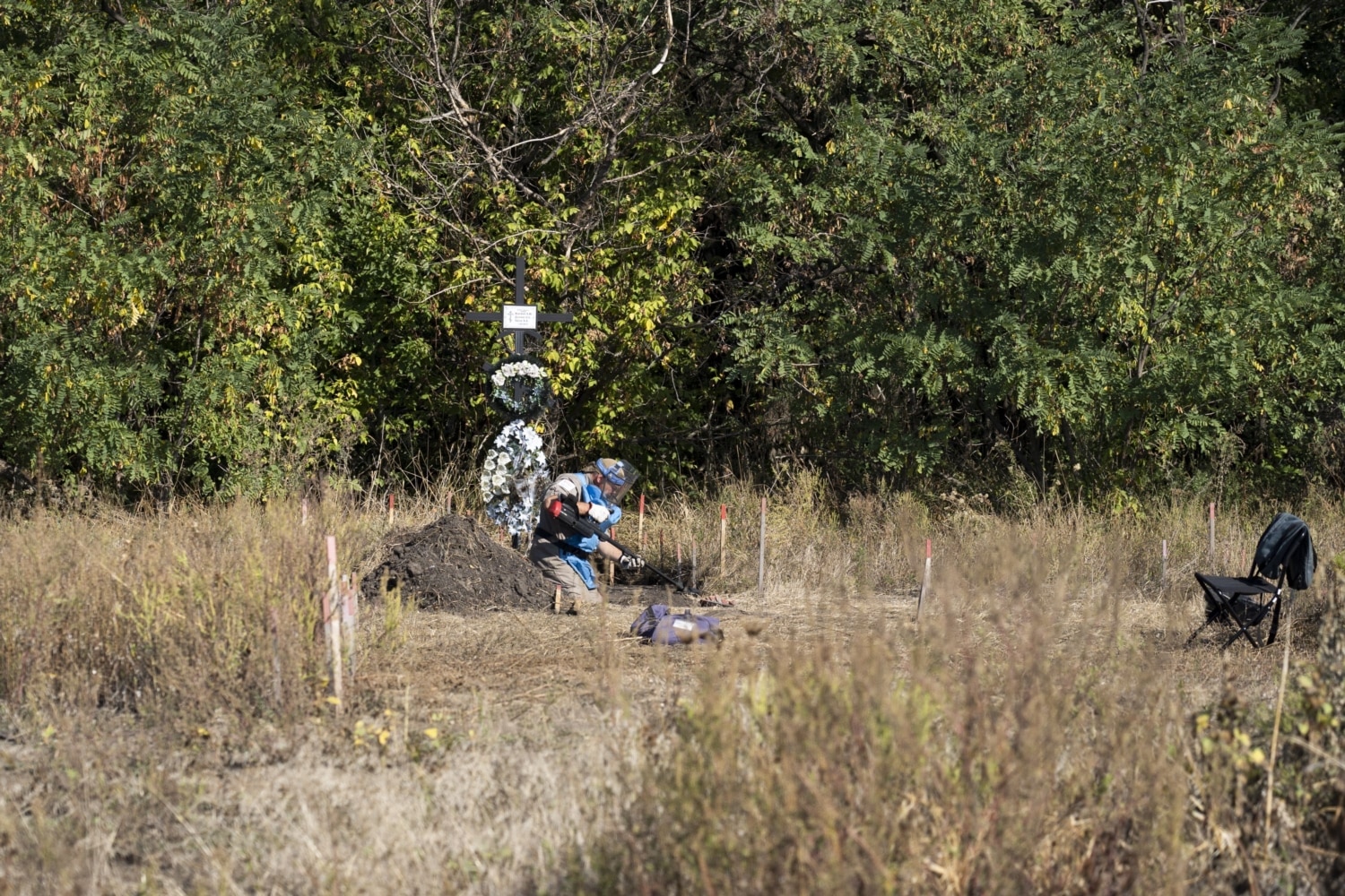 Збоку поля видніється хрест у вицвілих вінках. Біля нього цілий день працює один сапер. Це складна ділянка, де він працює переважно методом екскавації – шар за шаром знімає грунт, дістаючи осколки.