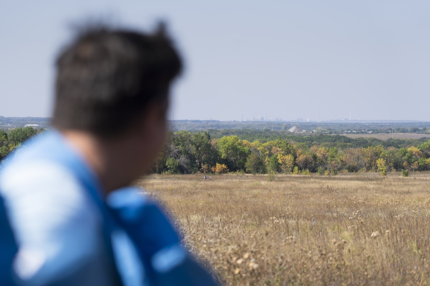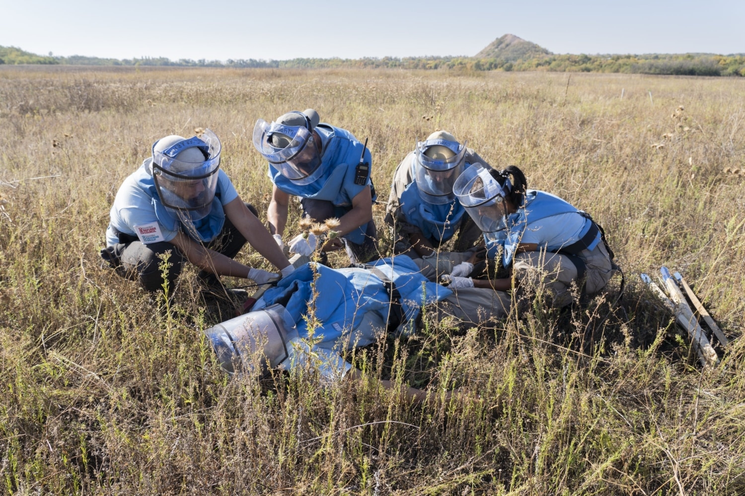 У взуття набиваються колючки, до ніг липнуть реп’яхи. Заважає, постійно сповзаючи з голови, візор – протиосколкове забрало: він важкий і не тримається на обличчі, коли не звик. Швидким кроком долаємо горбувату місцевість, намагаючись не відстати від чотирьох людей з ношами і парамедика. Команда тренується евакуювати пораненого демінера: медична машина чекає на чистій ділянці, ми йдемо до неї по хрусткій траві між різнокольорових кілків. Такими кілками розмічене все поле на виїзді з Лисичанська у бік Золотого – крайнього населеного пункту біля лінії розмежування із ОРЛО. Поле не орали вже 4 роки: воно стало степом.