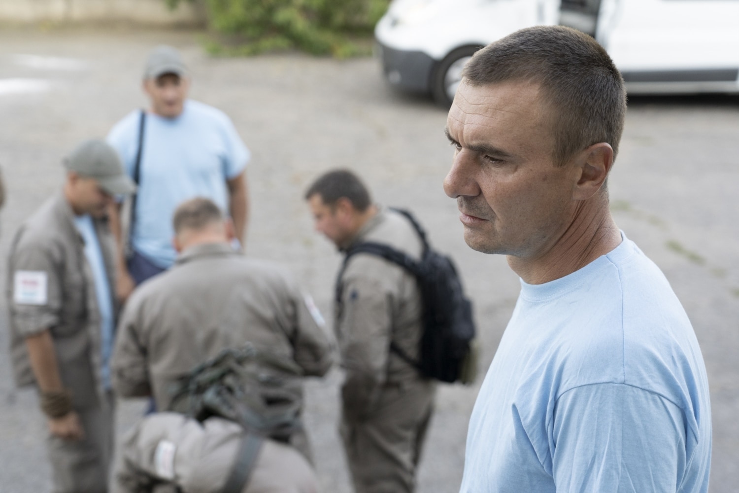 Володимир терапевт, закінчив Луганський медуніверситет. Його машина чергує з розрахунком на групу, що працює через дорогу, машина колеги стоїть на чистій ділянці прилеглого поля – для іншої групи. Коли вони працюють, салон звільнений від усього стороннього, двері відчинені, парамедик нікуди не відлучається.