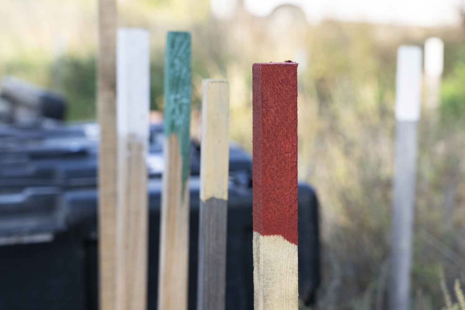 Синій, червоний, зелений, жовтий, смугастий. Кілки встромлені в ряд при дорозі. Це зразки. Далі, у полі, вони розміщені в суворій послідовності.