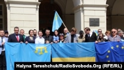 Символічна таблиця з назвою – «Площа Ринок» – у цей день написана українською, англійською та кримськотатарською, щоб показати, що Львів боротиметься за право кримських татар жити на рідній землі.