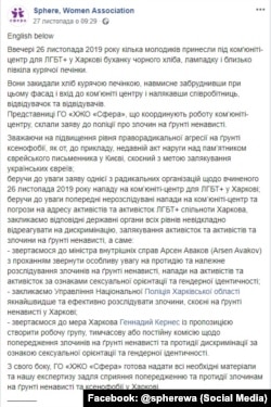 26 листопада у «Сфері» повідомили про те, що «кілька молодиків принесли під ком'юніті-центр для ЛГБТ+ у Харкові буханку чорного хліба, лампадку і близько півкіла курячої печінки», яку потім кидали на фасад будівлі.