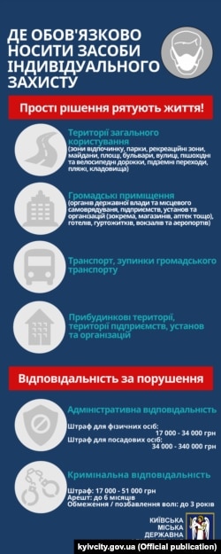 Відповідно до рішень влади, за порушення правил карантину, серед яких і відсутність маски в громадському місці, накладається адміністративний штраф на суму від 17 тисяч гривень до 34 тисяч гривень, можлива й кримінальна відповідальність.