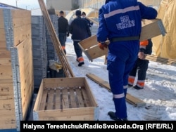 Мобільний госпіталь, який належить ДСНС, розгортають рятувальники. Намети встановлюють на снігу. Дорогу перед мобільним шпиталем розчищають від талого снігу. Цей тимчасовий госпіталь застосують при надзвичайній ситуації з поширенням коронавірусної інфекції.