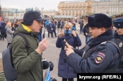 Один із низки одиничних пікетів у центрі столиці Росії проти окупації українського Криму. Москва, 17 березня 2019 року