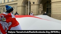 Білоруси, які зараз проживають у Львові, заспівали під час заходу національний гімн і розгорнули біло-червоно-білий прапор.
