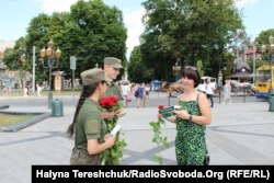 Бійці Нацгвардії роздають листівки з іменами полонених моряків у Львові, 7 липня 2019