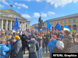 У німецькому Мюнхені 27 лютого відбулося одразу три акції протесту проти нападу Росії на Україну. Одна з них проходить у центрі міста перед Оперним театром, над яким майоріє український прапор.