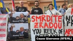Напередодні саміту Володимира Путіна і Дональда Трампа на Алясці 15 серпня, в межах якого президенти РФ і США обговорюватимуть питання врегулювання російсько-української війни, активісти у Празі вийшли до американського посольства на акцію під назвою «Мюнхен 1938, Аляска 2025? Не продавайте Україну!».