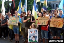 Пікетувальники вимагали відставки голови Тристоронньої контактної групи від України на переговорах у Мінську Леоніда Кучми та президента України Володимира Зеленського.