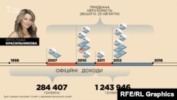 Загалом, як підрахували журналісти – лише у власності офіційно екс-дружини Татькова – 23 об’єкти нерухомості. При цьому, за даними «Схем» з податкової, до переїзду судді у столицю Красильникова офіційно заробила трохи більше 280 тисяч гривень, а з 2011 по 2012 рік – трохи більше мільйона.